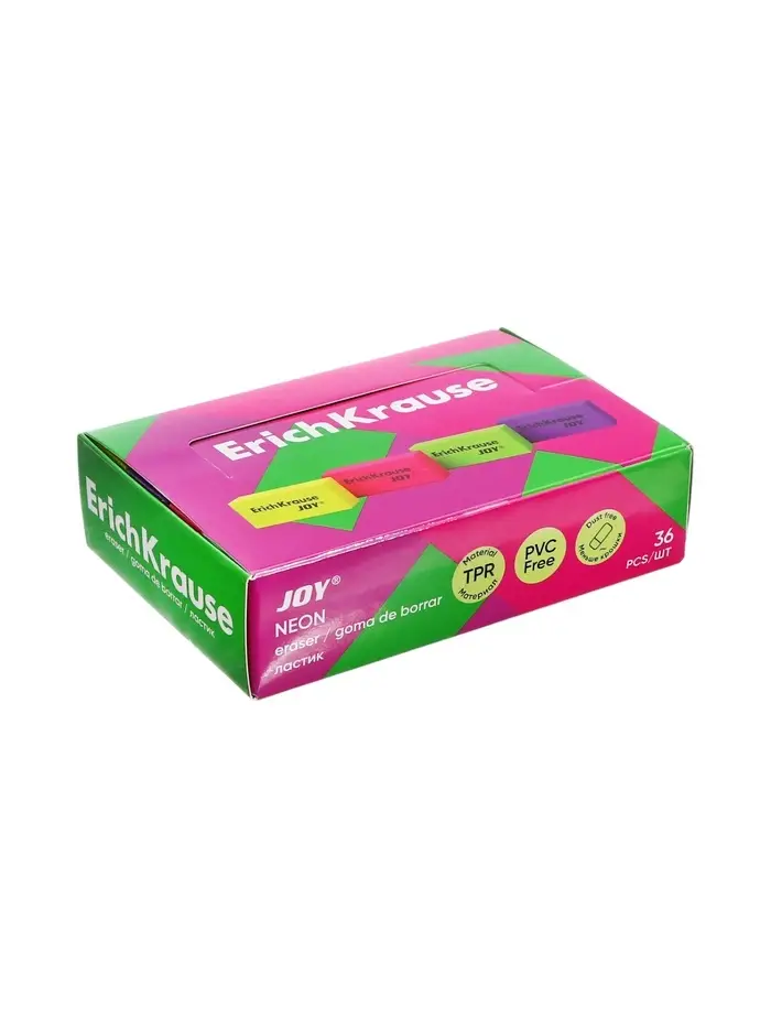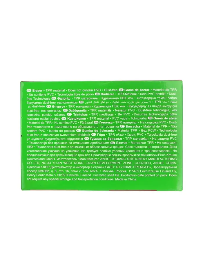 Мягкий ластик классической формы из экологически чистого и гипоаллергенного материала термопластичной резины (TPR) с пониженным образованием крошек (Dust free) выполнен в ярких неоновых цветах. Размер 40ммх20ммх10мм. Не содержит ПВХ.