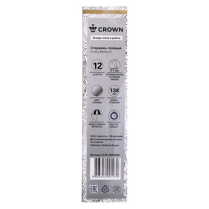 Стержень гелевый 0,7 мм, Crown Hi-Jell Metallic, 138 мм, чернила серебро металлик
