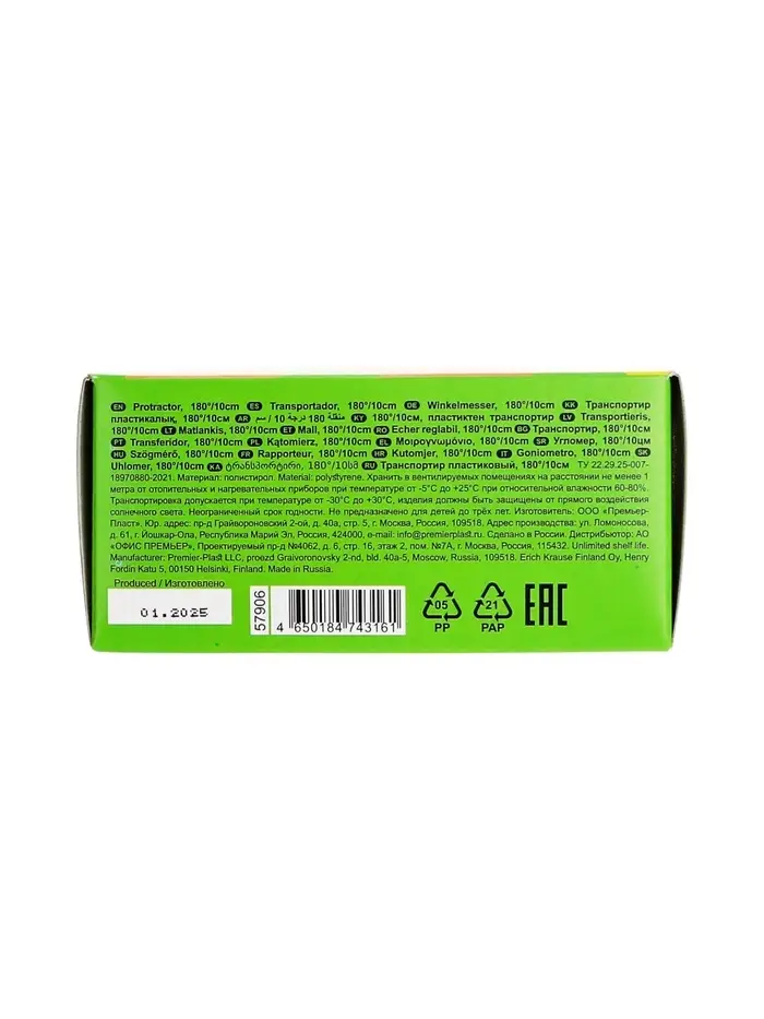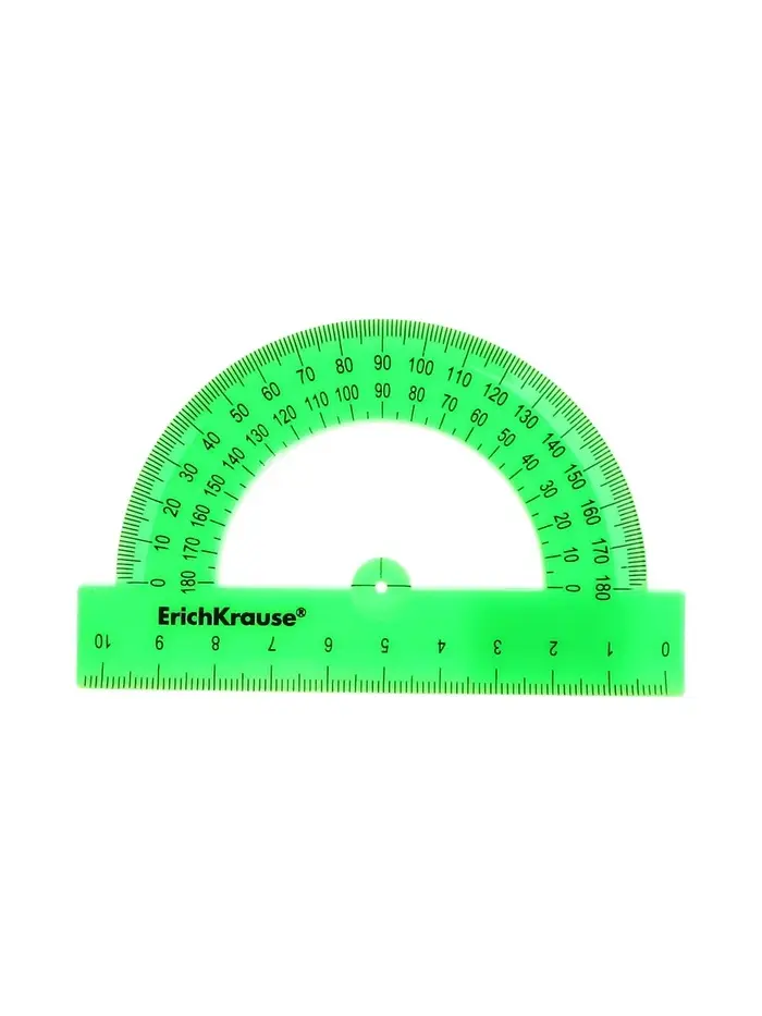 Прозрачный транспортир 180 градусов из высококачественного пластика. Длина разметки – 10 см.