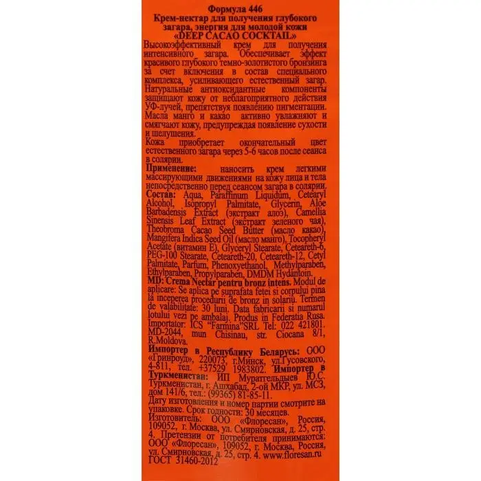 Крем-нектар Deep Cacao Coctail для получения глубокого загара, с маслом манго и какао, 15 мл