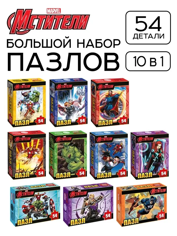 Пазлы детские для мальчиков «Мстители», набор 10в1, 54 детали в каждом