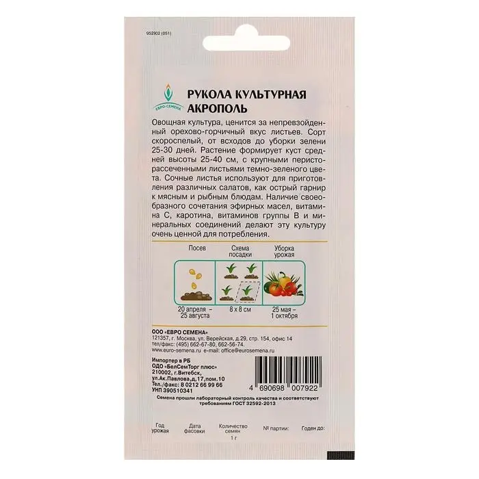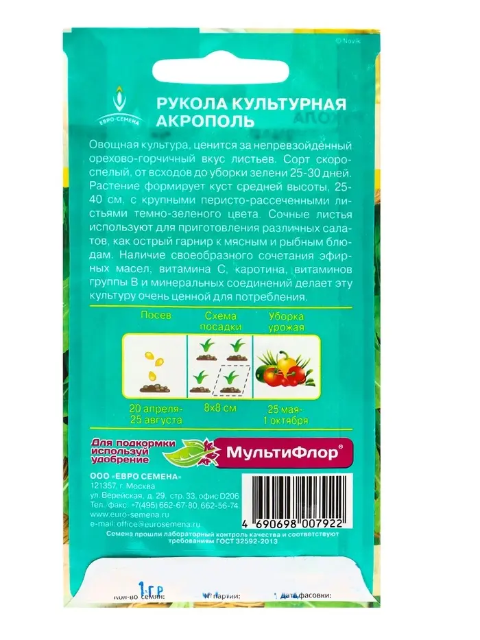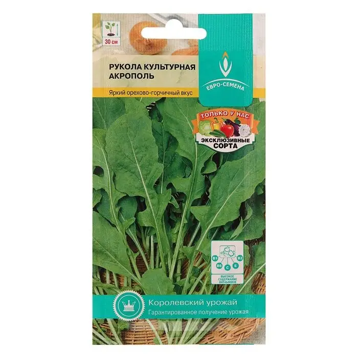 Перистые тёмно-зелёные листья рукколы с орехово-горчичным вкусом добавят оригинальности вашему салату, мясному или рыбному блюду. Растения сорта «Акрополь» ценят за скороспелость: период от всходов до уборки составляет всего 30 дней.