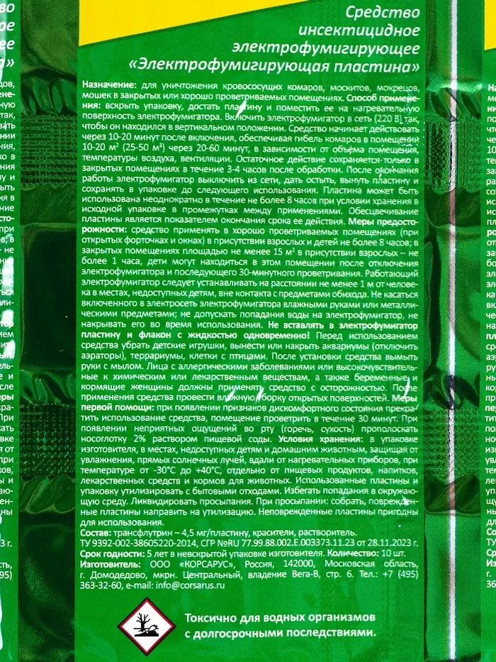Средство инсектицидное "Пластины от комаров без запаха". Используется с универсальным электрофумигатором SuperBAT. Полное уничтожение комаров в закрытом помещении достигается, примерно, за 1 час. Одна пластина рассчитана на работу в течение 8-9 часов. При открытых форточках или окнах электрофумигатор с пластиной можно оставить включенным на всю ночь для уничтожения насекомых, залетающих в помещение.Способ применения: извлечь из упаковки пластину, поместить её на нагревательную поверхность электрофумигатора, включить его в электросеть (220 В). Средство начинает действовать через 10-15 минут после включения. Полное уничтожение комаров достигается примерно за 1 час. При открытых окнах или форточках электрофумигатор с пластиной можно оставить включенным на всю ночь для уничтожения насекомых, залетающих в помещение. После окончания работы электрофумигатор выключают, пластину сохраняют до следующего использования. Одна пластина рассчитана на работу в течение 8-9 часов. Замену пластины следует проводить, отключив электрофумигатор от электросети.Состав: ДВ - эсбиотрин (15 мг/пластину), растворитель, краситель.