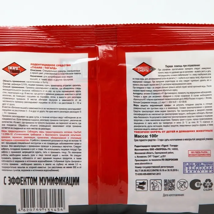 В местах обитания мышей в зависимости от их численности приманку раскладывают порциями на расстоянии 3-5 м друг от друга . Но одно место раскладки расходуют 5-10 г приманки.