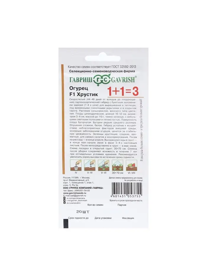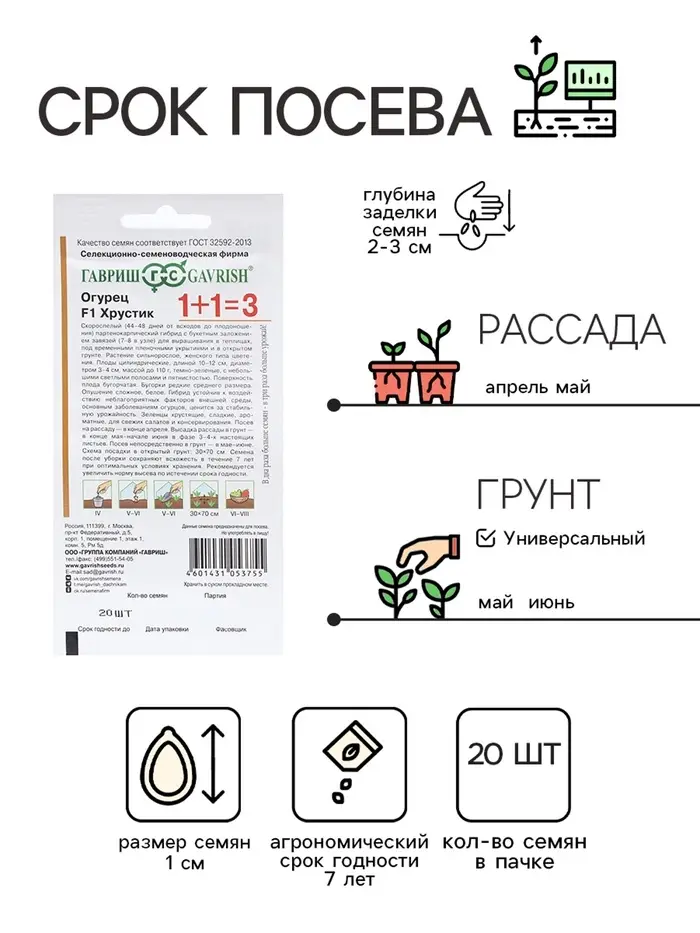Семена Огурец "Хрустик", F1, корнишон, серия 1+1, 20 шт