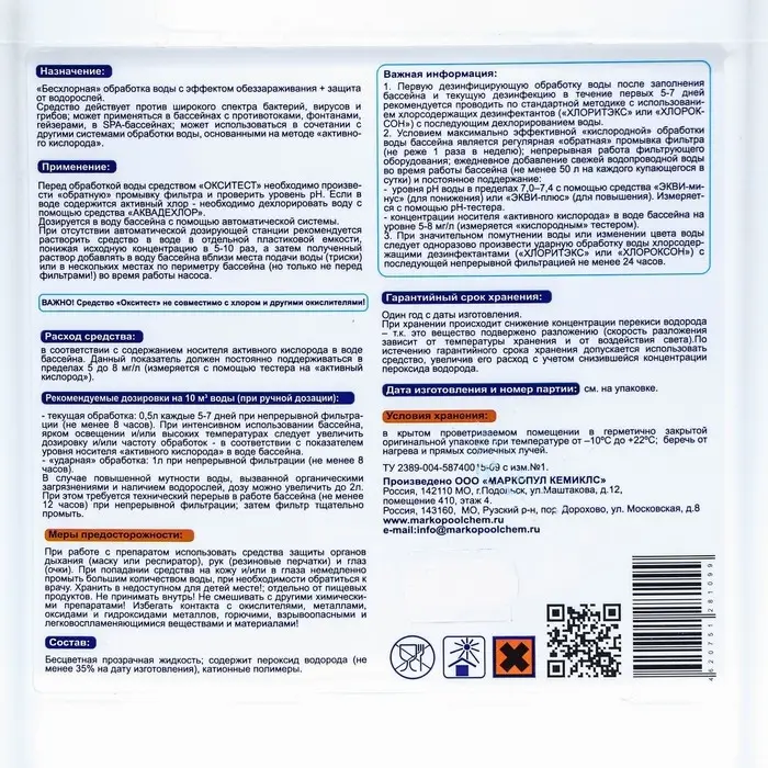 ВАЖНО! Средство «Окситест» не совместимо с хлором и другими окислителями!