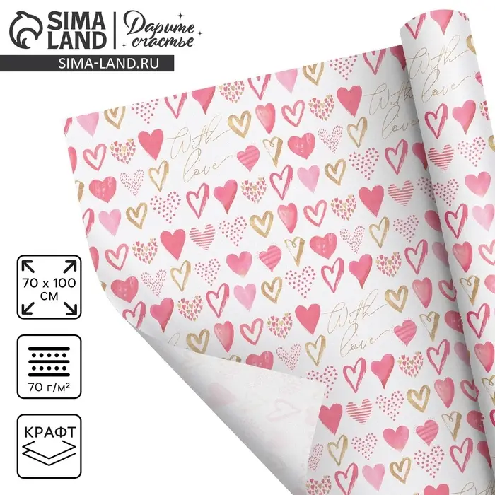 Бумага упаковочная крафтовая «С Любовью», 70 х 100 см