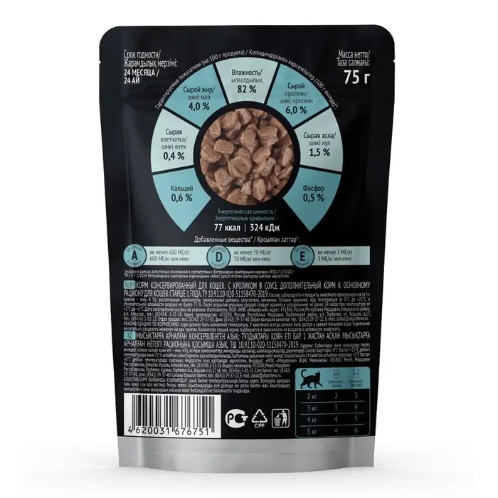 Состав: субпродукты и продукты животного происхождения (в т.ч. кролик – мин. 4 %), растительные компоненты, минеральные добавки, загустители, витамины.