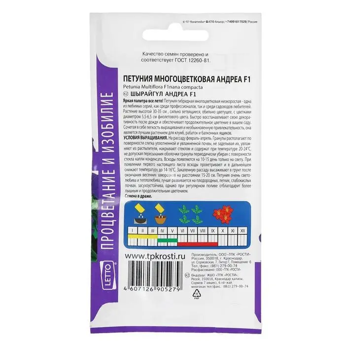 Семена цветов «Петуния Андреа F1», однолетник, 10 шт. — светолюбивое и теплолюбивое растение, высотой 30−35 см, сильно ветвящееся, обильно цветущее. Цветки диаметром 5,5−6,5 см, фиолетового цвета.