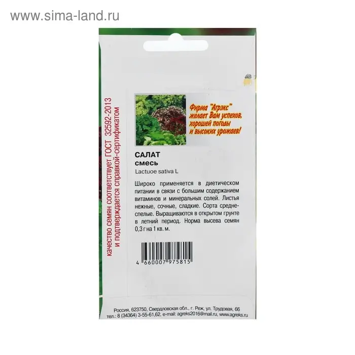 Смесь включает в себя несколько разнотипных сортов салата, как листовых, так и кочанных, с различной формой листа и окраской от светло-зеленой до темно-красной. Листья салата содержат много каротина и минералов - имеют самое большое, среди овощных культур, содержание кальция. Салат способствует регулированию обмена веществ, применяется при лечении заболеваний органов пищеварения и способствует выведению из организма холестерина. Высевается салат в несколько сроков – с ранней весны и до осени, может выращиваться как в открытом грунте, так и в защищенном.