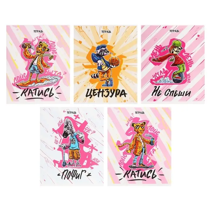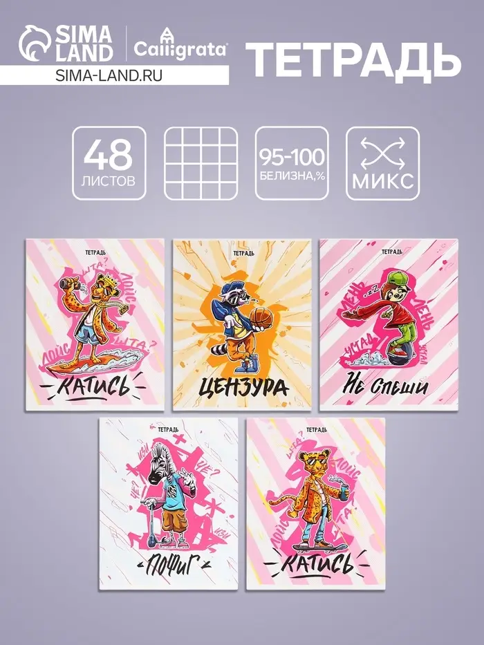 Комплект тетрадей из 5 штук, 48 листов в клетку Calligrata "Любимые питомцы", обложка мелованная бумага, блок №2, белизна 75% (серые листы)