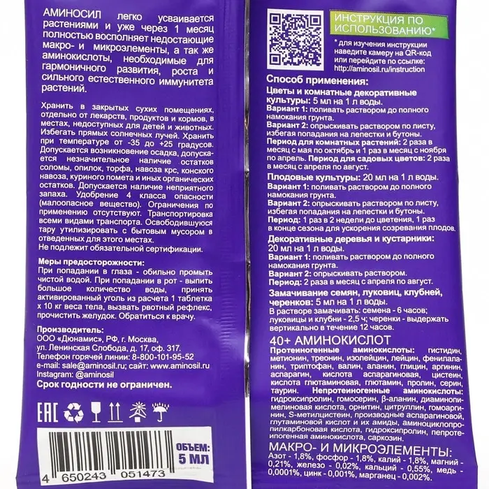 Витамины Аминосил для растений содержит комплекс из питательных веществ, макро и микроэлементов, которые снабжают растения всем необходимым для хорошего здоровья и роста. Он обеспечивает их эффективной подкормкой на огороде и дома, благодаря чему увеличивается урожайность и качество плодов. Может использоваться в любое время года, в любом количестве и с любым типом воды. Способствует росту и развитию корневой системы, повышает устойчивость к заболеваниям и стрессам, улучшает качество урожая, позволяет увеличить урожайность.Цветы и комнатные декоративные культуры:5 мл АМИНОСИЛ разбавить в 1 л воды до образования однородного раствора.Вариант 1: поливать раствором до полного намокания грунта.Вариант 2: опрыскивать раствором по листу, избегая попадания на лепестки и бутоны.Период для комнатных растений: 2 раза в месяц с мая по октябрь и 1 раз в месяц с ноября по апрель.Период для садовых цветов: 2 раза в месяц с апреля по август.Плодовые культуры:20 мл АМИНОСИЛ разбавить в 1 л воды до образования однородного раствора.Вариант 1: поливать раствором до полного намокания грунта.Вариант 2: опрыскивать раствором по листу, избегая попадания на лепестки и бутоны.Период: 1 раз в 2 недели до цветения, 1 раз в конце сезона для ускорения созревания плодов.Декоративные деревья и кустарники:20 мл АМИНОСИЛ разбавить в 1 л воды до образования однородного раствора.Вариант 1: поливать раствором до полного намокания грунта.Вариант 2: опрыскивать раствором.Период: 2 раза в месяц с апреля по август.Замачивание семян, луковиц, клубней, черенков:5 мл “Аминосил” разбавить в 1 л воды.В получившемся растворе замачивать:Семена - в течении 6 часовЛуковицы и клубни - в течении 2,5 часаЧеренки - выдерживать вертикально в течении 12 часовНасыщает растение, субстрат и почву всеми необходимыми витаминами;Укрепляет здоровье и иммунитет растения;Обеспечивает максимальную урожайность;Восстанавливает и улучшает декоративность растений;Улучшает защитные свойства в периоды засухи и заморозков.