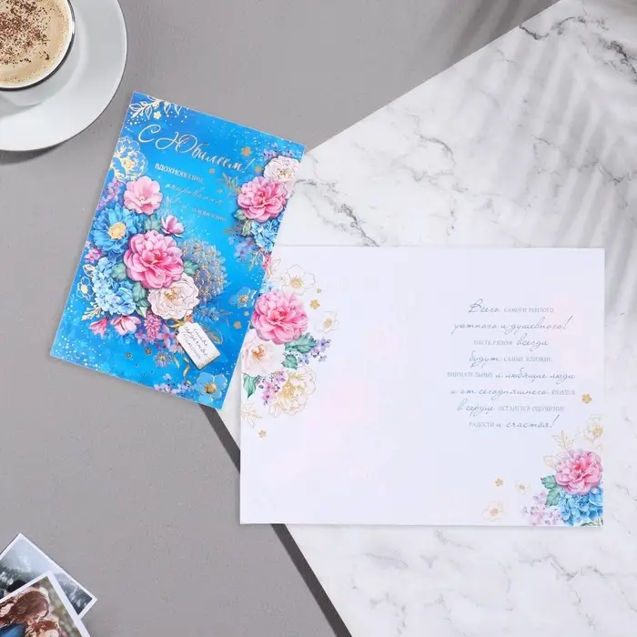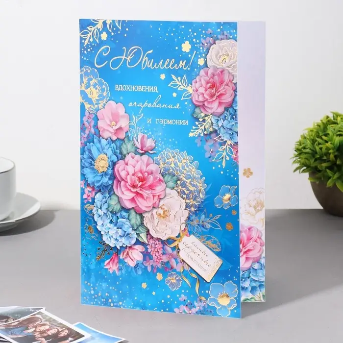 Открытка "С Юбилеем!" цветы, бирка, голубой фон, 12,5х19 см