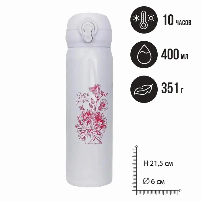 – Оптимальный объем - 400 мл - не займет много места. Подойдет как для повседневного использования, так и для активного отдыха.
