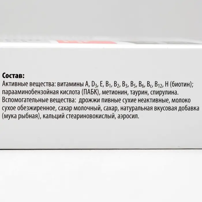 Активные вещества: витамины А, D3, Е, В1, В2, В3, В5, В6, Вс, В12, Н (биотин); парааминобензойная кислота (ПАБК); метионин, таурин, спирулина; дрожжи пивные сухие неактивные; мука рыбная (вкусовая добавка).