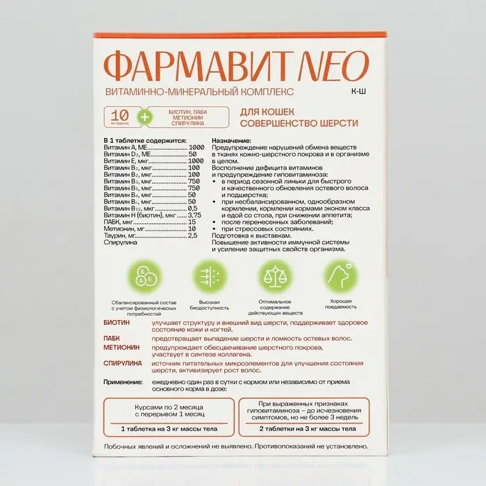Витаминный комплекс "Фармавит Neo" для кошек, совершенство шерсти, 60 таб