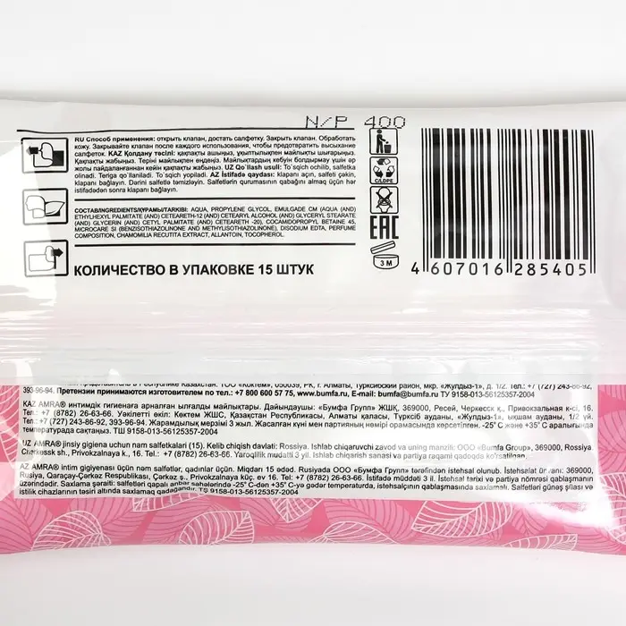 Влажные салфетки Amra, для интимной гигиены, женские, 15 шт.