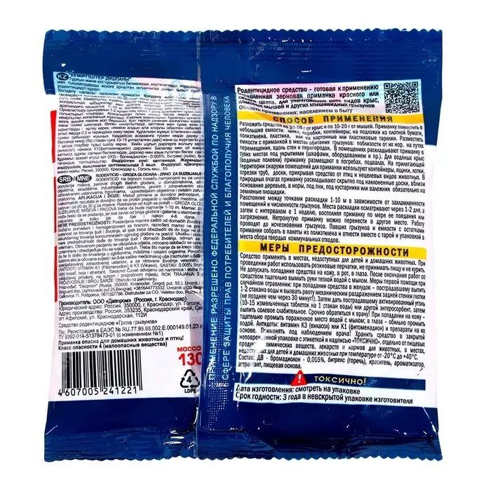 Способ применения: разложить приманку в лотки или на подложки по 50-100 г от крыс и по 20-30 г от мышей. Разместить в местах обитания грызунов. Расстояние между точками раскладки 2-15 м, в зависимости от захламленности помещений и численности грызунов. Места раскладки осматривают через 1-2 дня, а затем с интервалом в 1 неделю, восполняя приманку по мере ее поедания. Нетронутую приманку можно перенести в другое место. Работу проводят до исчезновения грызунов.