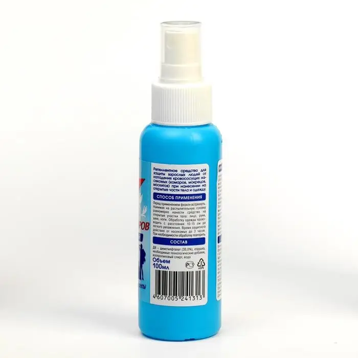 Назначение: cредство для защиты взрослых людей от нападения кровососущих насекомых (комаров, мокрецов, москитов).Способ применения: нанесение на открытые части тела и одежду.Состав: диметилфталат 100%.Форма выпуска: 100 мл, флакон с распылителем.Срок годности: 3 года в невскрытой упаковке производителя.