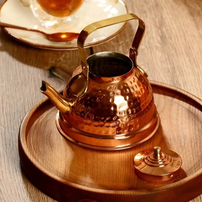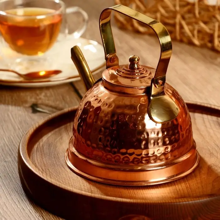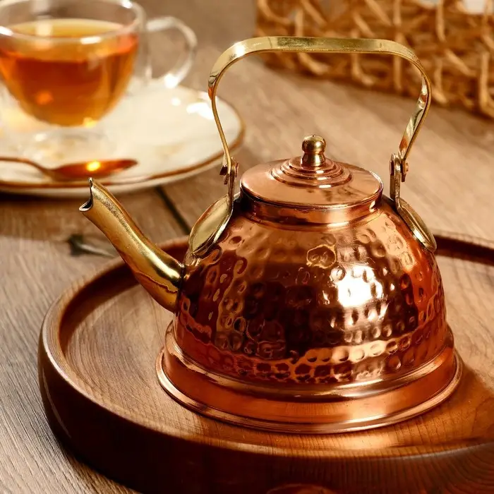 Необычный чайник медный 400 мл с насыщенным красноватым отливом, выполненный индийскими мастерами из сплава латуни и меди, станет не только Вашим помощником, но и настоящим украшением и достоянием кухни. Красотой этого пузатика будут любоваться даже Ваш электрочайник или термопот. Пейте чай с удовольствием, ну и, быть может, пригласите кого-нибудь на чашечку?