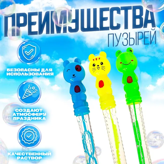 Яркое и волшебное развлечение для детей и взрослых! Мыльные пузыри «Животные» — настоящее путешествие в сказочный мир. Пузыри переливаются всеми цветами радуги, создавая неповторимую атмосферу праздника.