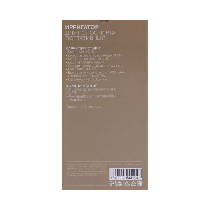 Ирригатор для полости рта Luazon LIR-02, портативный, 200 мл, 3 режима, 1 насадка, от USB