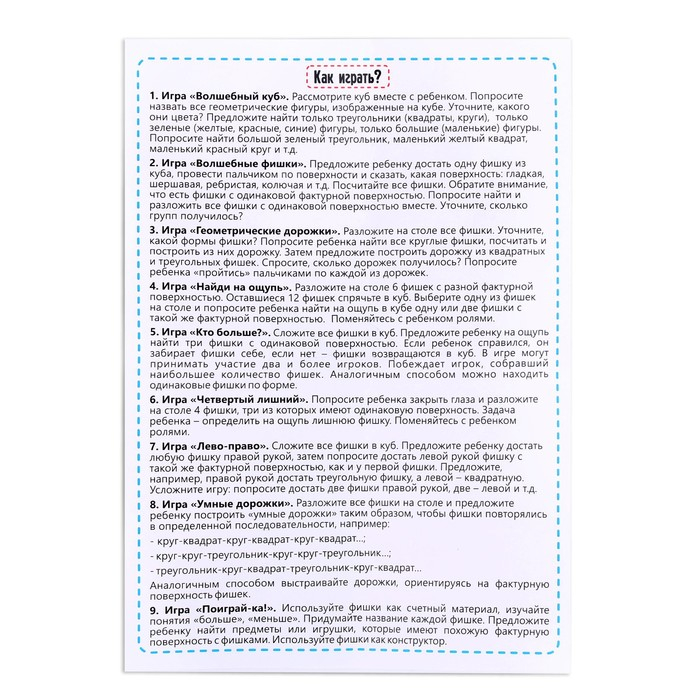 - Игра «Волшебные фишки». Доставайте фишки из куба на ощупь, описывайте фактуру, сортируйте по типу поверхности.