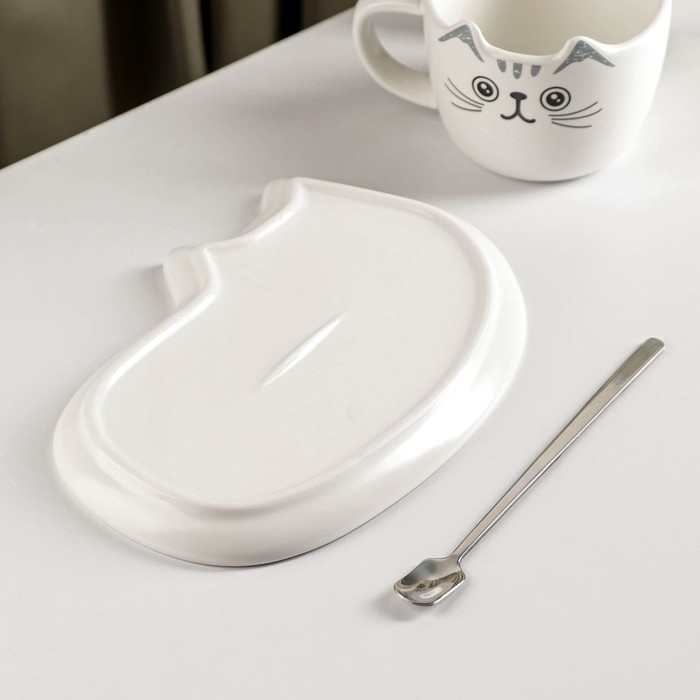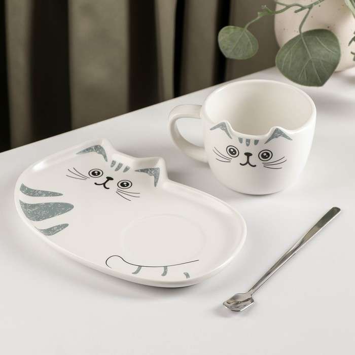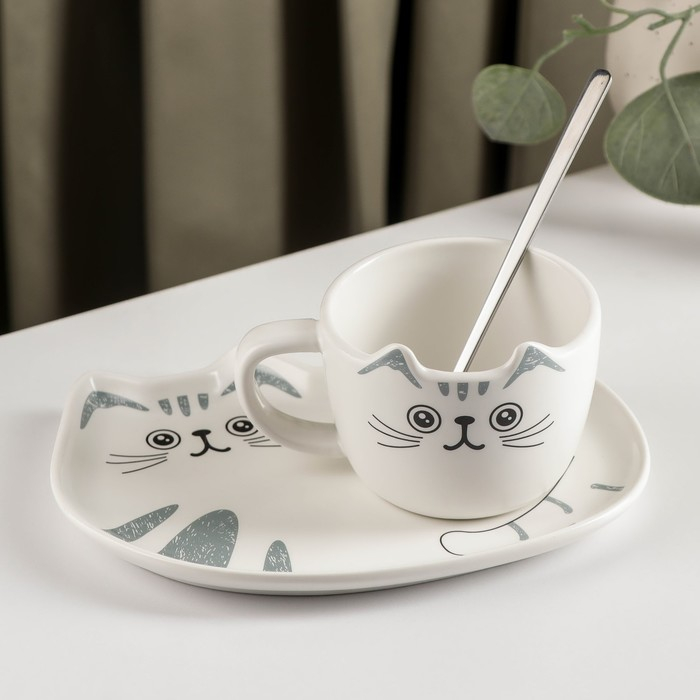 Чайная пара керамическая «Котик», 3 предмета: чашка 200 мл, блюдце 18,5×13,5 см, ложка