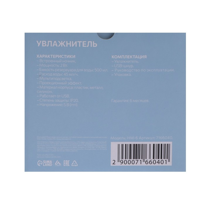 Насладись звёздным небом и увлажнённым воздухом прямо у себя дома с увлажнителем воздуха LuazON HM-6. Устройство поддерживает оптимальный уровень влажности воздуха в посмещении и позволяет заменить ночник. Устройство обладает низким энергопотребление и отличается бесшумной работой. Поэтому он отлично подойдёт для использования в дневное и в ночное время. Увлажнитель обладает яркой палитрой из красного, зелёного и синего свечения, которые последовательно сменяются. Наличие USB-провода позволяет подключить прибор к ноутбуку, прикуривателю, портативному аккумулятору или в розетку, через блок питания. Ёмкость устройства составляет 500 мл. Этого достаточно на 11 часов бесперебойной работы без дополнительного пополнения воды. С помощью ультразвука прибор выбивает мельчайшие капельки с поверхности воды, образуя туман. Он распространяется по всей площади и повышает относительную влажность воздуха. Также агрегат подавляет распространение вирусов и бактерий.