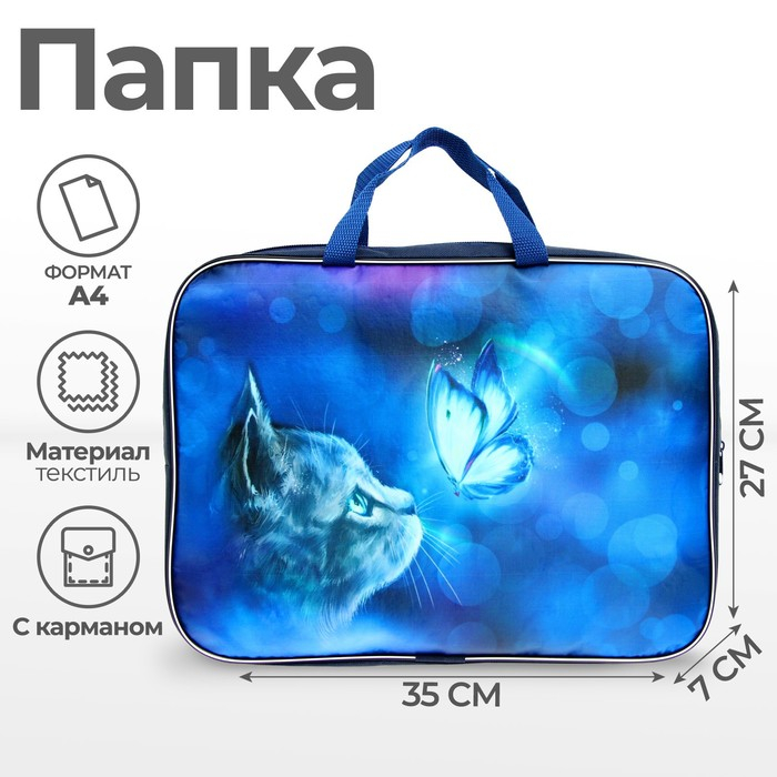 Папка текстильная на молнии с ручками, формат A4+. Размер 270 х 70 х 350 мм. Материал: износо-морозостойкий водоотталкивающий 100% полиэстер. Предназначена для транспортировки учебных принадлежностей, документов и различных аксессуаров. Имеет одно большое отделение с расширением и карманом внутри, застежка на молнии с мягким ходом. Для комфортной переноски ручки папки выполнены из прочной стропы
