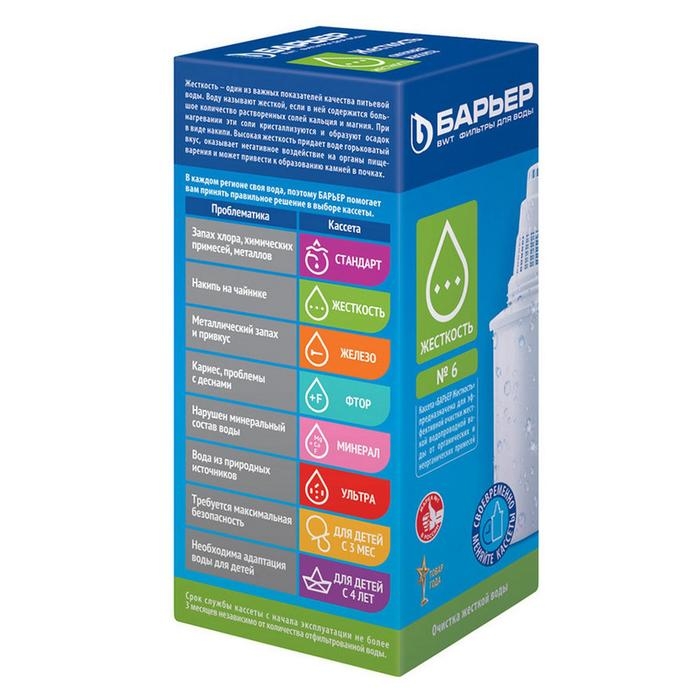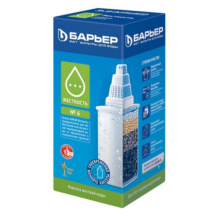 Кассета «Барьер 6» надёжно снимает избыточную жёсткость воды, при этом очищая её от основных загрязнителей — хлора и хлорорганических соединений, пестицидов, нефтепродуктов. В кассете содержится высококачественная ионообменная смола, которая эффективно снижает содержание ионов кальция и магния в воде, уменьшая её жёсткость.