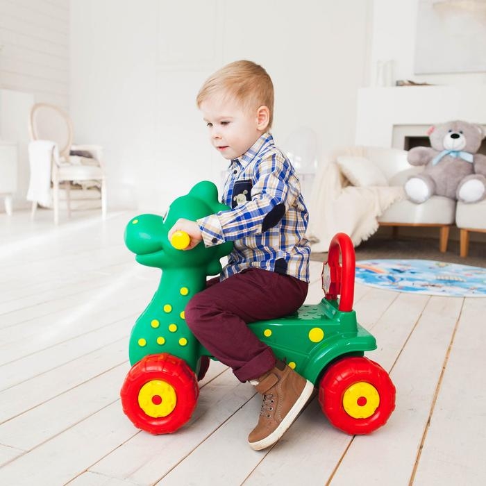Ваш парнишка мечтает приручить дракона? Тогда эта каталка — то, что вам нужно! Яркий дракон с доброй мордочкой станет лучшим другом и отличным помощником для малыша, который только начал делать свои первые шаги. На нём весело и совершенно безопасно кататься. Широкое сиденье с высокой спинкой, удобные ручки и большие рельефные колёса обеспечивают комфорт и устойчивость толокара во время езды.