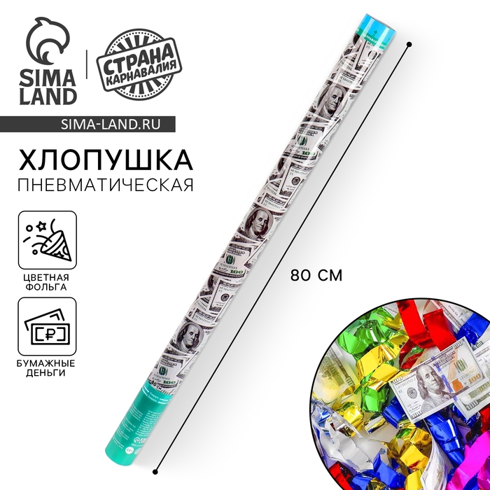 Пневмохлопушка «Доллар», серпантин, бумага, доллары, 80 см