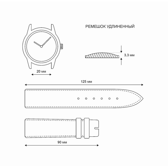 Ремешок для часов, мужской, 20мм, запряжник 90мм, горт 125 мм, натуральная кожа, удлиненный