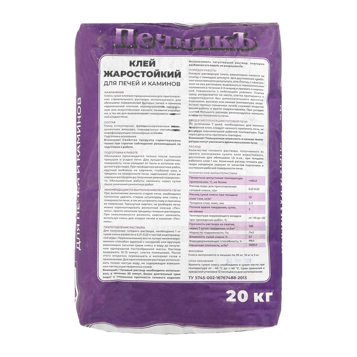 Смесь сухая клеевая предназначена для приготовления строительного раствора, используемого для облицовки поверхностей бытовых печей и каминов керамической плиткой, керамогранитом, натуральным или искусственным камнем, печными изразцами, а так же для выравнивания поверхности кирпичной кладки печи.