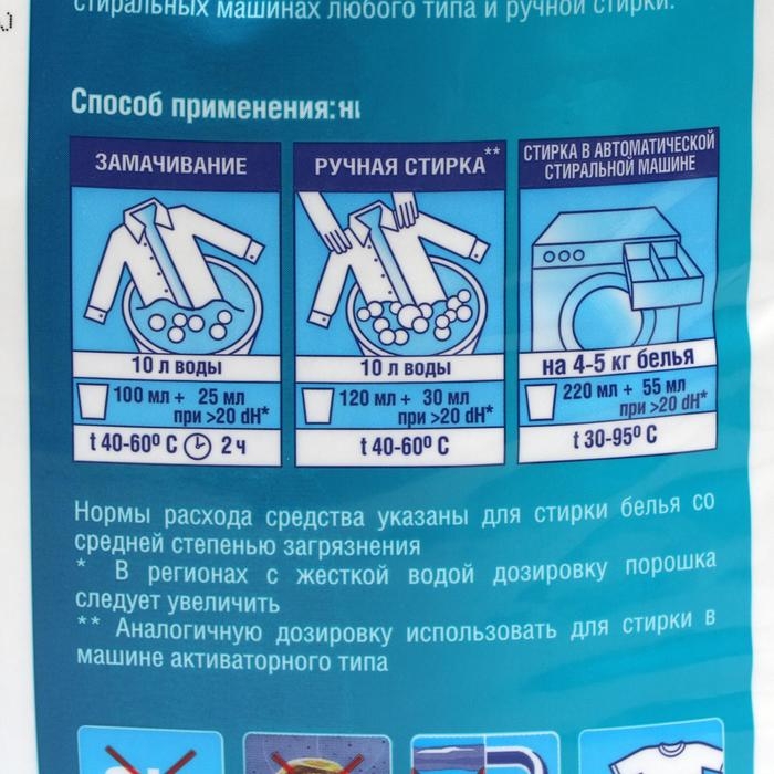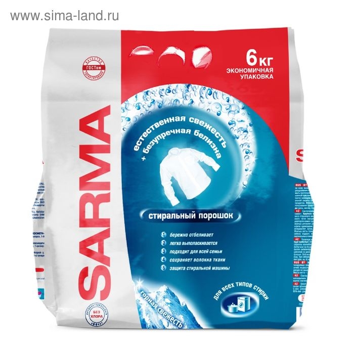 Предназначен для стирки изделий их хлопчатобумажных, льняных, синтетических и смешанных тканей, в автоматических, активаторных стиральных машинах, а также вручную. Благодаря оптимальному уровню пенообразования, универсальный стиральный порошок позволяет добиться безупречных результатов, как при ручной, так и при автоматической стирке. Он отлично отбеливает, удаляет въевшиеся загрязнения и желтизну из глубины волокон ткани, делая вещи белоснежными. Легкий аромат горной свежести почти не остается на белье после стирки, придает белью запах чистоты. Удаляет сапрофитов пылевых/бельевых клещей при стирке и обладает доказанным антибактериальным эффектом. Очень важно, что в составе нет хлора, который разрушает волокна ткани и вреден для нашего здоровья. После стирки Сармой бельё станет чистым и свежим! Не содержит хлор. Антибактериальный эффект подтвержден ФБУН НИИ Дезинфектологии Роспоребнадзора.