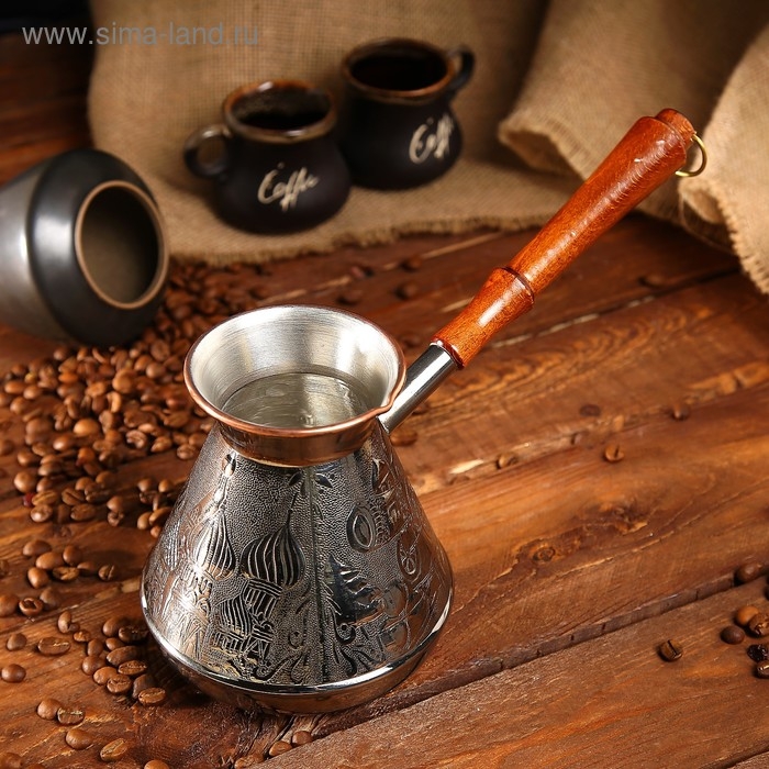 Эта турка имеет узкое горлышко и специальное внутреннее покрытие из пищевого олова, которое предохраняет медь от окисления.