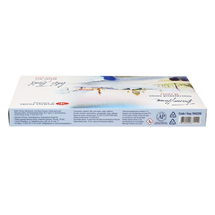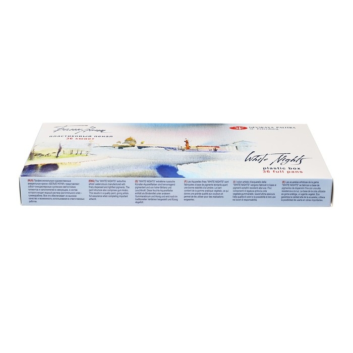 Профессиональные художественных акварельные краски "Белые ночи" представляют собой тонкодисперсные суспензии пигментов и наполнителей в связующем, в состав которого входит водный раствор растительного клея – гуммиарабика. Высокая концентрация пигмента обеспечивают максимальную интенсивность цветового тона акварели. Насыщенность сохраняется даже при разбавлении большим количеством воды. Отличаются прозрачностью, что дает возможность художнику работать тонкими лессировками. Чистые цвета позволяют писать в смесях и получать богатое многообразие оттенков. Основная часть красок обладает высочайшим показателем светостойкости, что способствует сохранности работ свыше 100 лет. Все это обеспечивает их высокое качество и возможность использования в ответственных работах. Палитра набора "Белые ночи" из 36 цветов наиболее полно раскрывает потенциал живописных приемов и техник акварели. Набор представлен в пластиковом пенале со съемной палитрой.