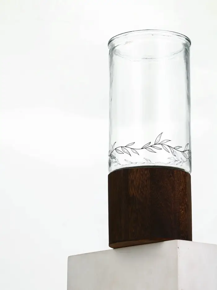Стеклянная ваза с деревянной подставкой, 10х25,5х10 см