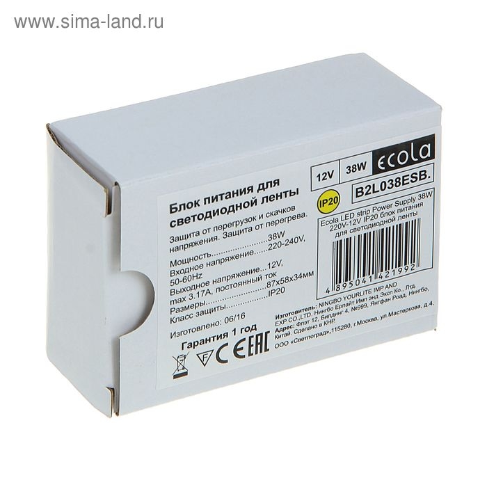 Блок питания Ecola для светодиодной ленты 12 В, 38 Вт, IP20