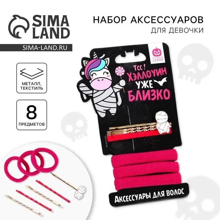 Набор резинок отлично украсит и надёжно зафиксирует любую прическу,аневидимки идущие в копмлекте дополнят образ для хэллоуина или разнообразят повседневный. Набор подойдёт в качестве подарка дочке, внучке, сестре или подруге.