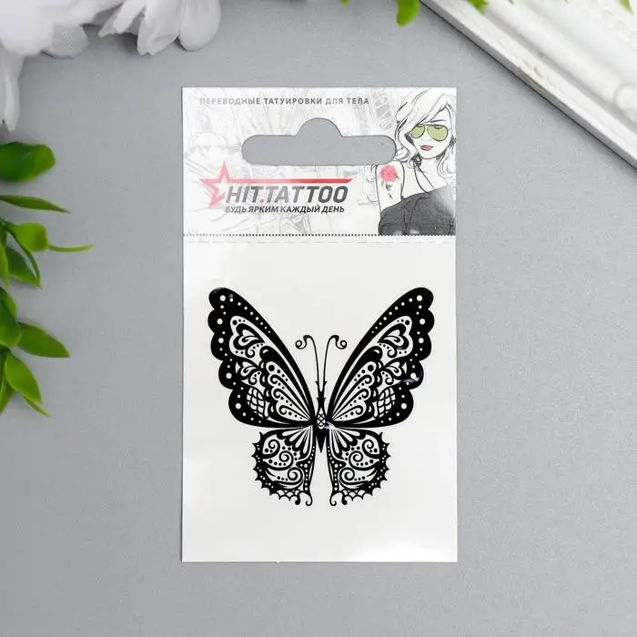 Элегантная чёрная бабочка размером 5.3×6.3 см — это мгновенное преображение вашего образа без игл и боли. Её изящные крылья с детализированным узором создают эффект настоящего тату, добавляя образу загадочности и стиля.