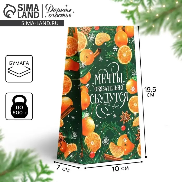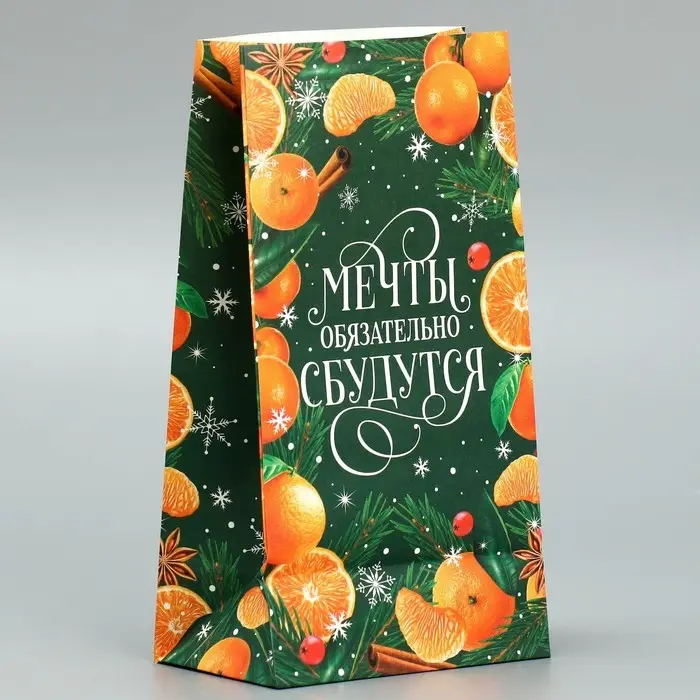 Пакет без ручек «Мечты обязательно сбудутся», мандарины, 10 х 19.5 х 7 см, Новый год