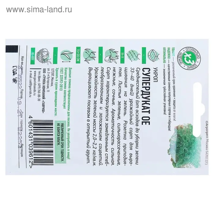 Среднеспелый (от всходов до уборки зелени 33-40 дней) урожайный сорт для выращивания на зелень. Розетка приподнятая. Листья зеленые, сильнорассеченные, нежные, сочные. Ароматичность сильная. Сорт характеризуется замедленным стеблеобразованием и заложением соцветий. Посев семян в грунт производится в конце апреля - начале мая. Урожайность зеленой массы 2,0-2,2 кг/м?.