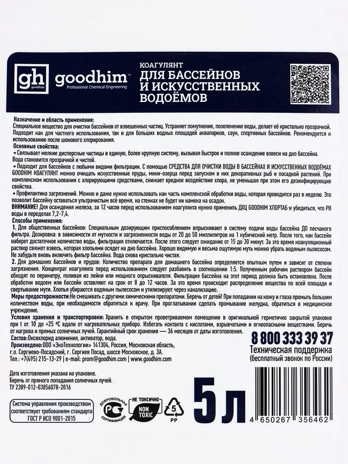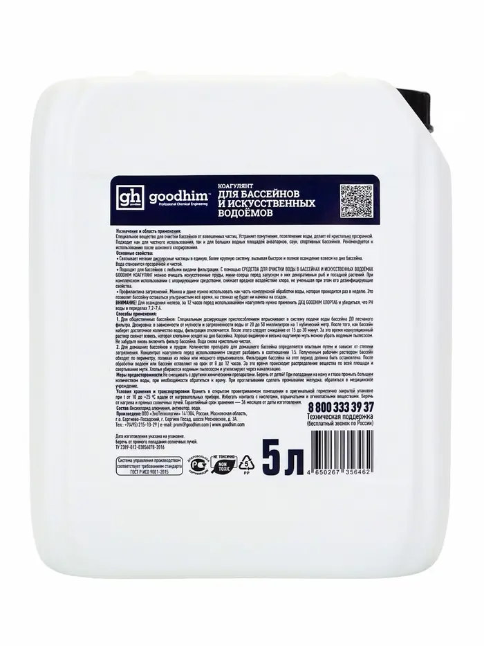 Коагулянт для очистки воды в бассейнах и искуственных водоемах Goodhim Коагулянт, 5 л