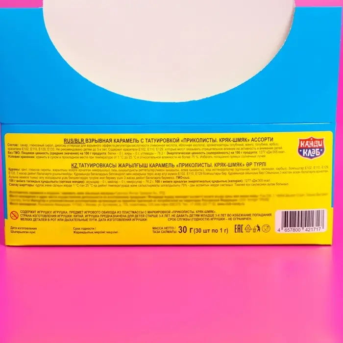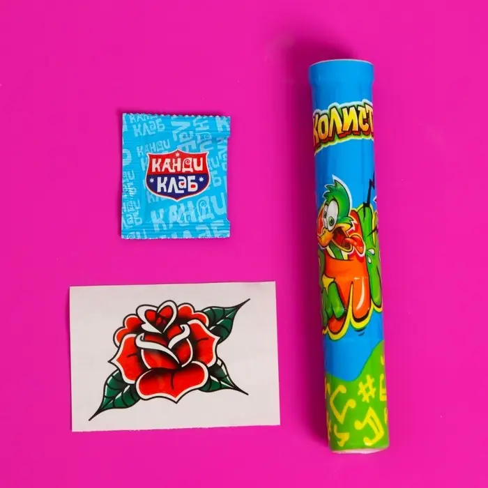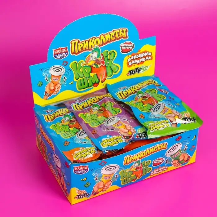 Взрывная карамель с переводной татуировкой и игрушкой - это уникальное и захватывающее лакомство, которое сочетает в себе вкус и развлечение.