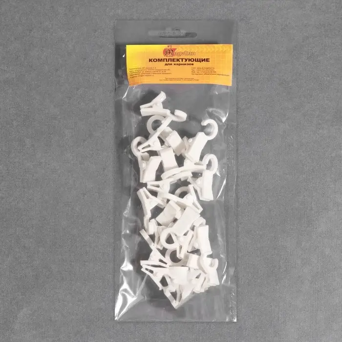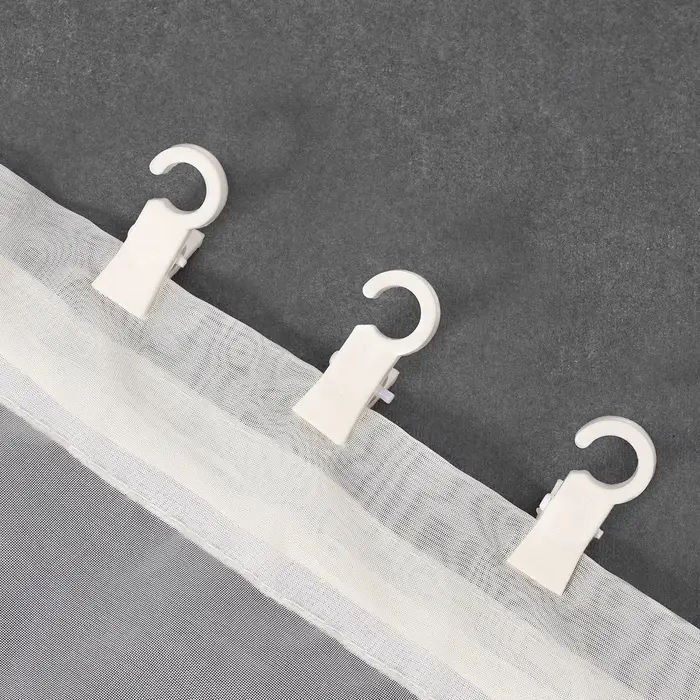 Прочный зажим надёжно зафиксирует ткань, не оставляя затяжек, так как он сделан из мягкого пластика. С одной стороны зажима есть крючок, который крепиться в кольце для карниза.