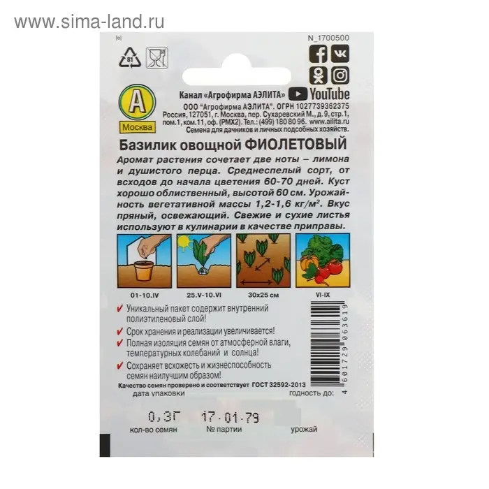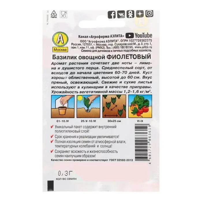 Семена Базилик овощной "Фиолетовый" "Лидер", пряность, 0,2 г ,