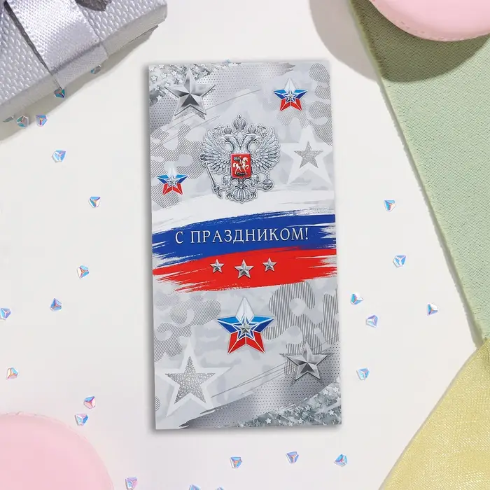 Открытка-евро "С Праздником!" тиснение, конгрев, серый фон, 11х21,5 см