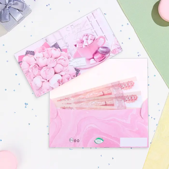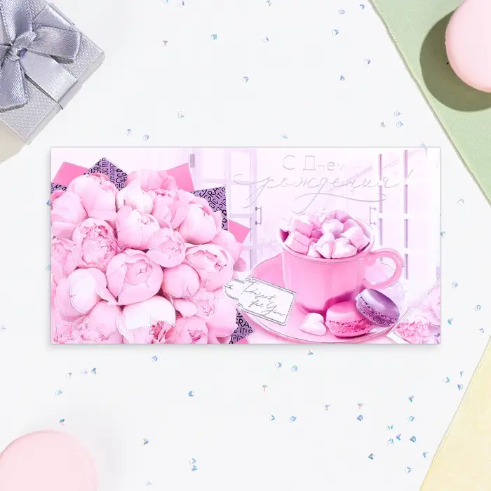 Конверт для денег "С Днём Рождения!" чашка сладостей, тиснение, 16,5 х 8,5 см